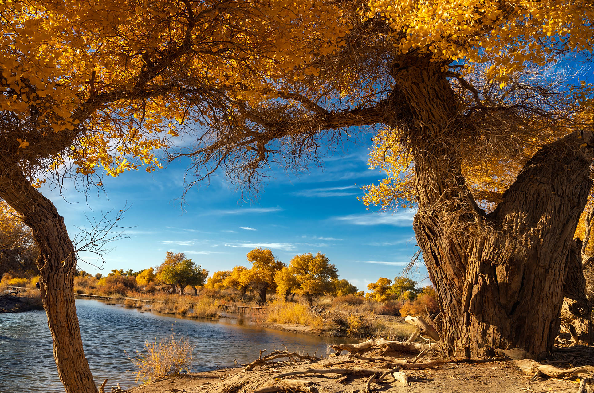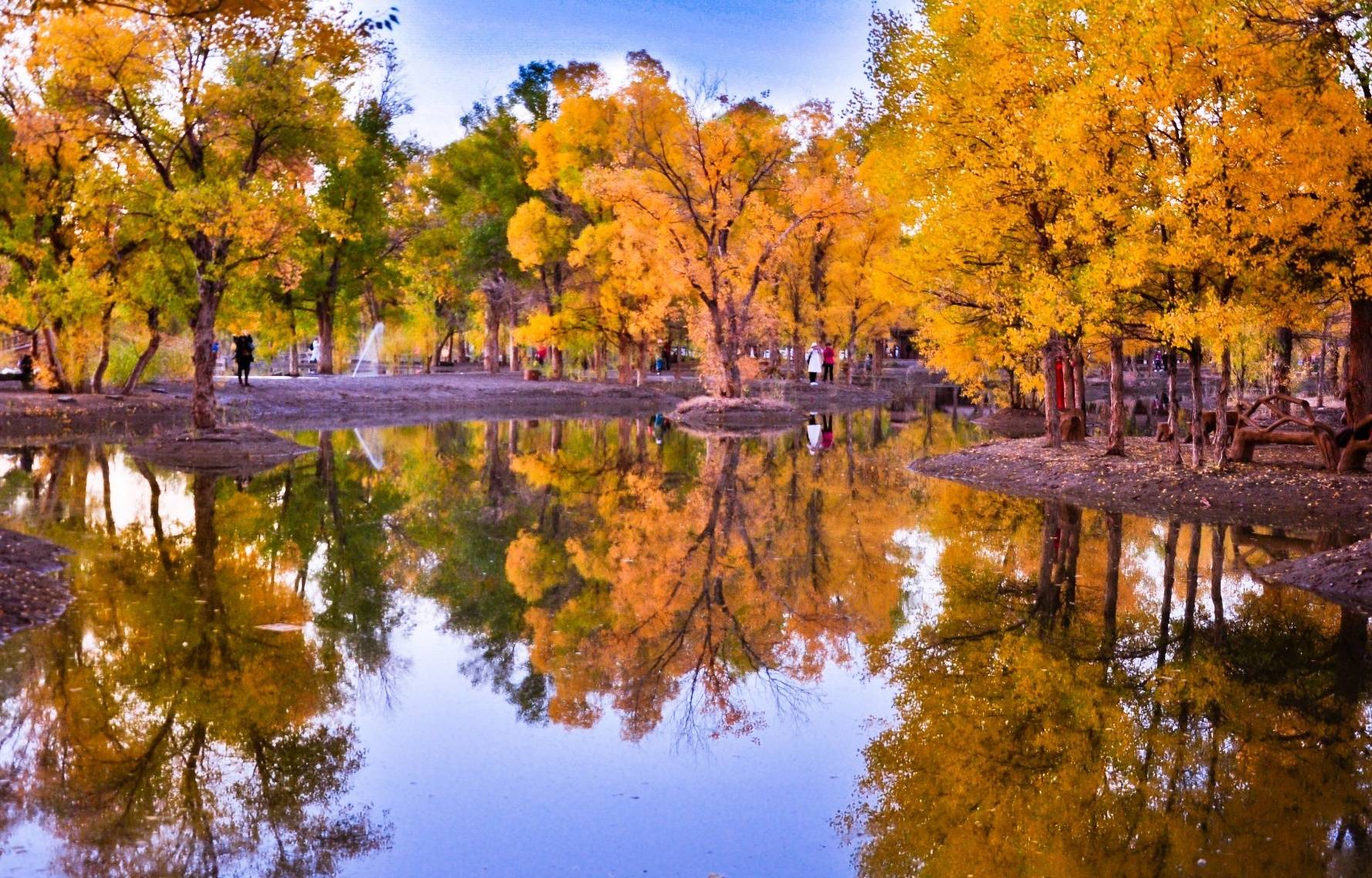 二道桥倒影林,这里有大片的胡杨倒映在水中,形成了一幅绝美的画面。湖水清澈见底,与金黄的胡杨相互映衬,构成了一幅天然的油画。尤其是在清晨和傍晚,阳光洒在水面上,波光粼粼,胡杨的倒影更加清晰美丽,吸引了众多摄影爱好者前来拍摄。