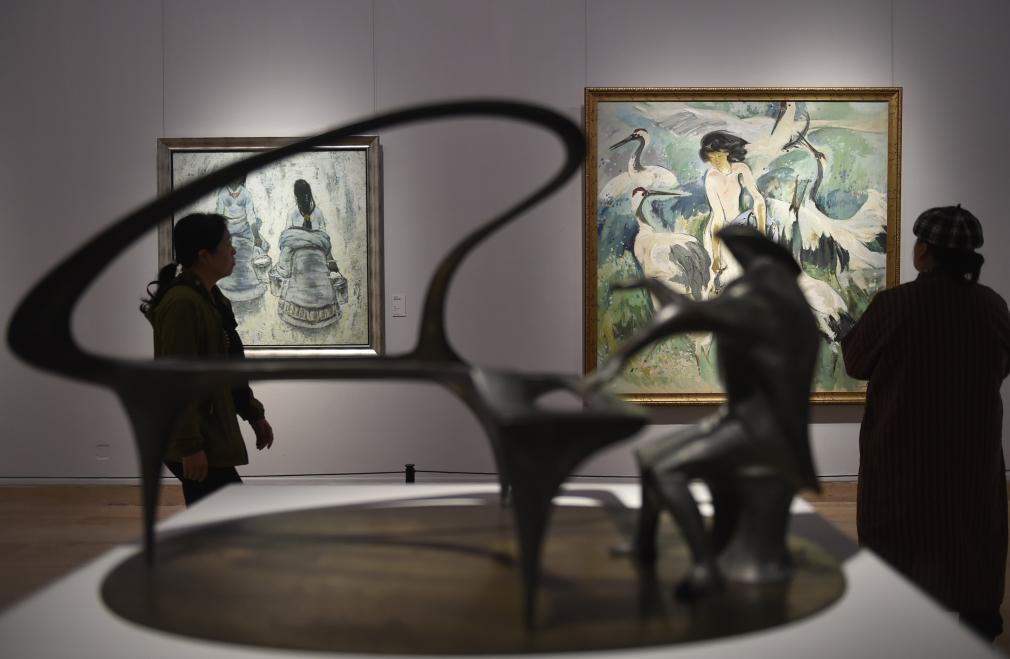 9月27日,观众在中国美术馆参观雕塑作品《苦旅共甘泉》。