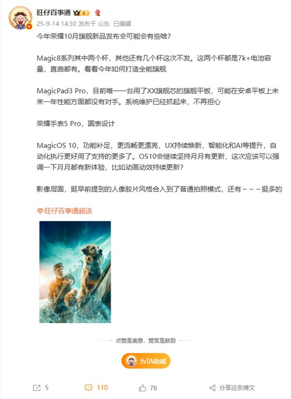 该博主透露,荣耀MagicPad3 Pro将采用13.3英寸LCD超高刷大屏,电池容量将破万,预计将和荣耀Magic8系列一起发布。